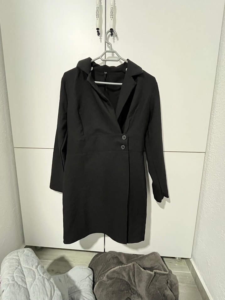 Düğmeli, siyah keten midi uzunluğunda . Çentikli yaka ve uzun kollu gömlek elbise
