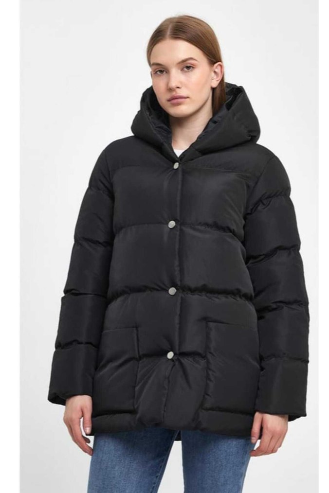Düğmeli, kapüşonlu siyah midi kış montu, bol kesim ve uzun kollu, yumuşak ve sıcak kumaştan yapılmıştır. Sorunu yoktur 40/42 beden uyumlu