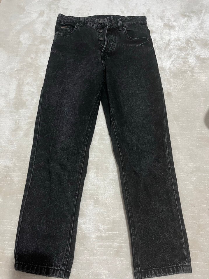 Düğmeli siyah denim kot pantolon, regular fit ve midi boyda. Günlük sokak stili için uygundur.