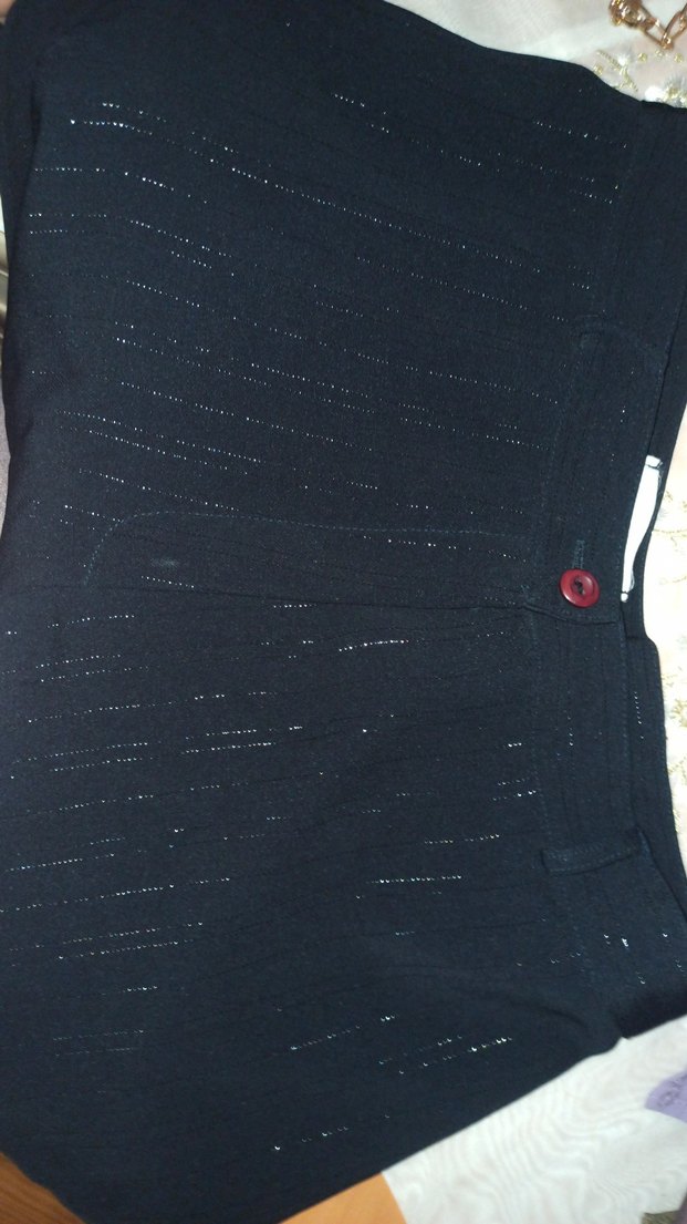 Düğmeli kapamalı, sentetik kumaştan yapılmış, siyah ve midi boyda, bol kesim kadın pantolonudur. parlak şeritleri vardır düşük beldir markası Tanseldir.