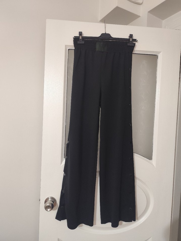 Düğmeli, regular kesim siyah kadın kumaş pantolon. Sentetik kumaştan üretilmiştir, günlük ve sokak stili için uygundur.yanlar düğmeli bol kesim rahattır