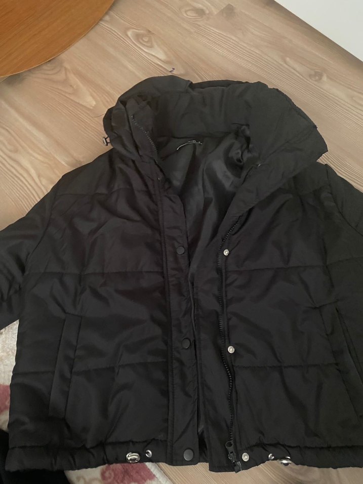 Düğmeli, uzun kollu siyah midi mont. Rahat kesimli, yakası kesik ve yumuşak, sıcak dokulu kumaştan günlük kullanım için uygun. Kapşonludur