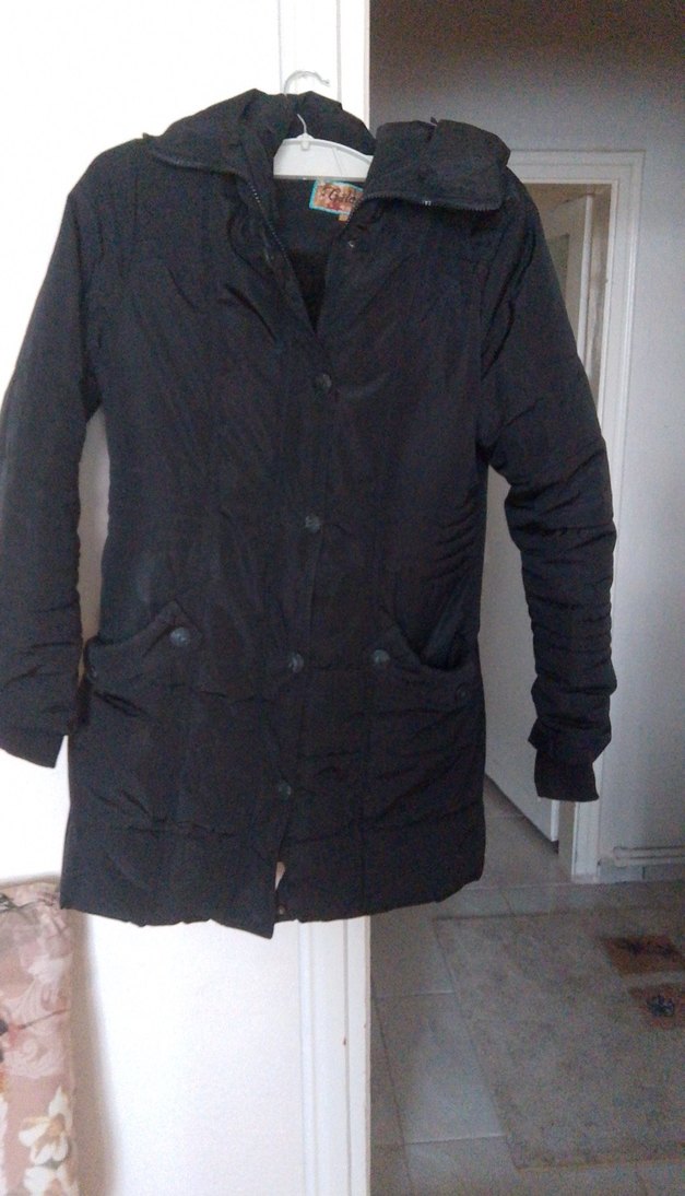 Düğmeli, siyah midi boy, dar kesim kadın mont. Uzun kollu, yumuşak ve sıcak dokulu kumaştan, günlük kullanıma uygun goth tarzında.