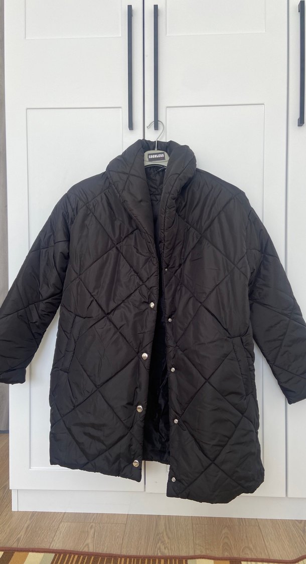 Düğmeli, siyah midi uzunlukta kadın mont. Notlu yaka ve rahat kesimi ile günlük kullanıma uygun, yumuşak ve sıcak kumaştan üretilmiştir. 1-2 kez giyildi