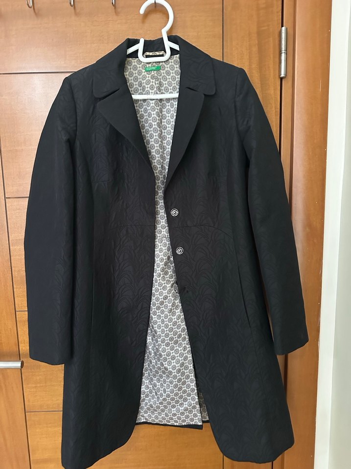 Düğmeli, siyah midi uzunluğunda kaban, keskin yaka ve uzun kollu. Düz, sentetik kumaştan üretilmiş, ofis kullanımı için uygun.