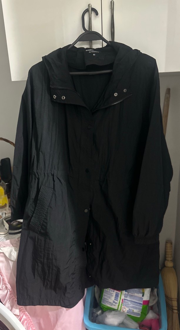 Siyah midi uzunlukta, yüksek yakalı ve düğmeli kapamalı parka. Uzun kollu ve bol kesim, yumuşak ve sıcak kumaştan, günlük kullanım için uygundur.