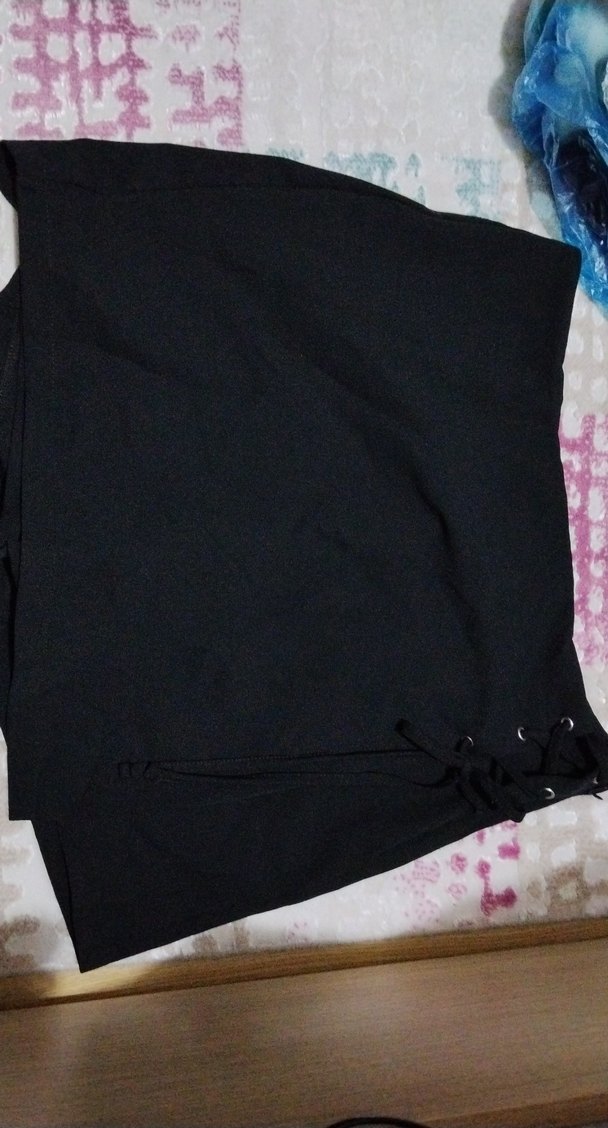 Düğmeli, siyah midi kadın şort eteği, bol kesim ve sentetik yumuşak kumaştan yapılmıştır.