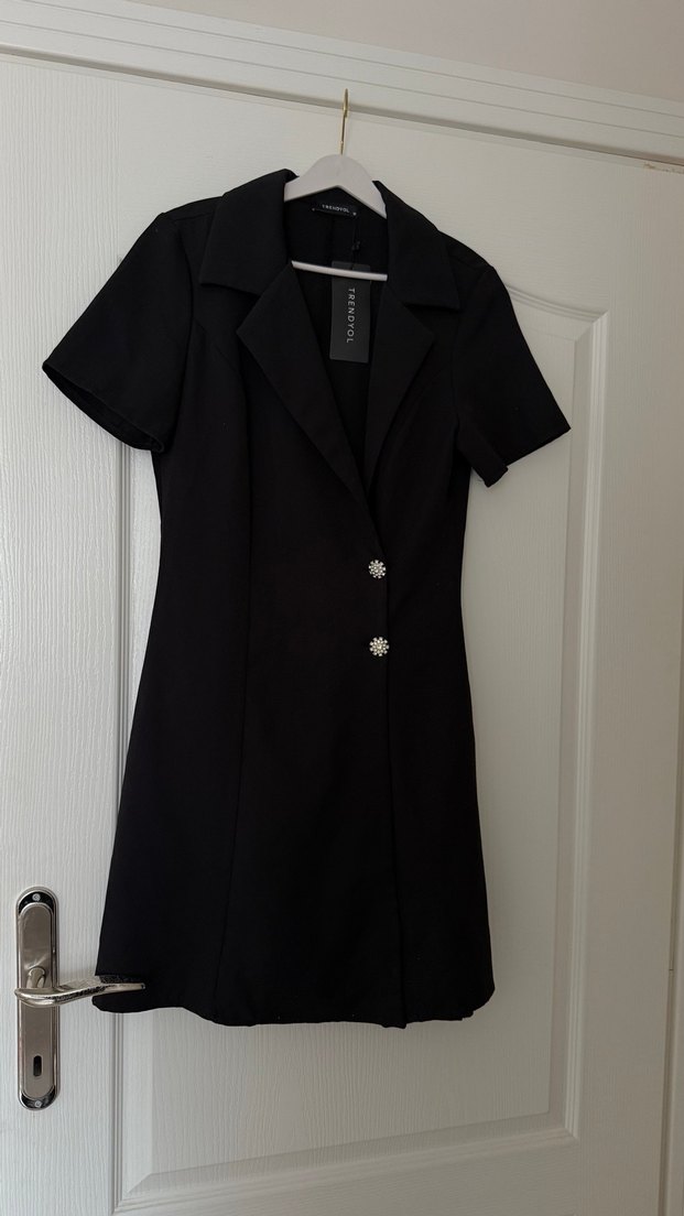 Düğmeli, kısa kollu, siyah midi kadın takım elbisesi. Notched lapel yakalı, regular fit ve sentetik kumaştan üretilmiştir. Ofis için goth tarzında uygun. Hiç kullanılmamış etiketi üzerinde