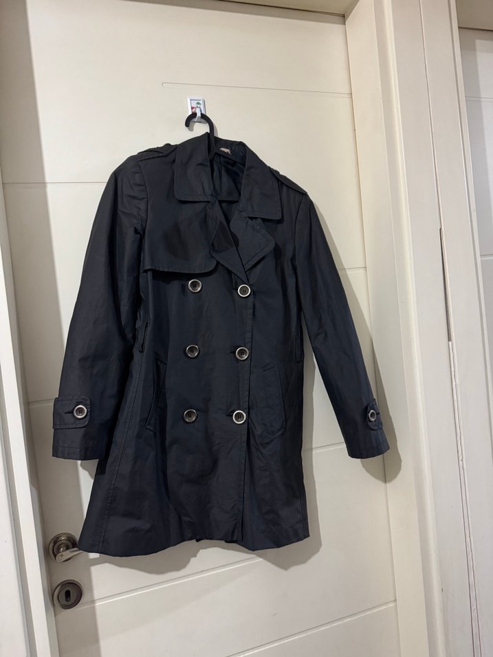 Düğmeli önü ve yaka detayıyla siyah, vücuda oturan midi trençkot. Sentetik kumaştan, uzun kollu ve desensiz, günlük kullanıma uygun.