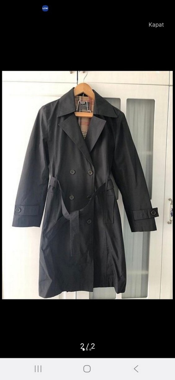 Düğmeli ön, kesik yaka ve askılı kollarıyla siyah midi trençkot. Sentetik kumaştan, normal kesim, ofis kullanımı için uygundur.