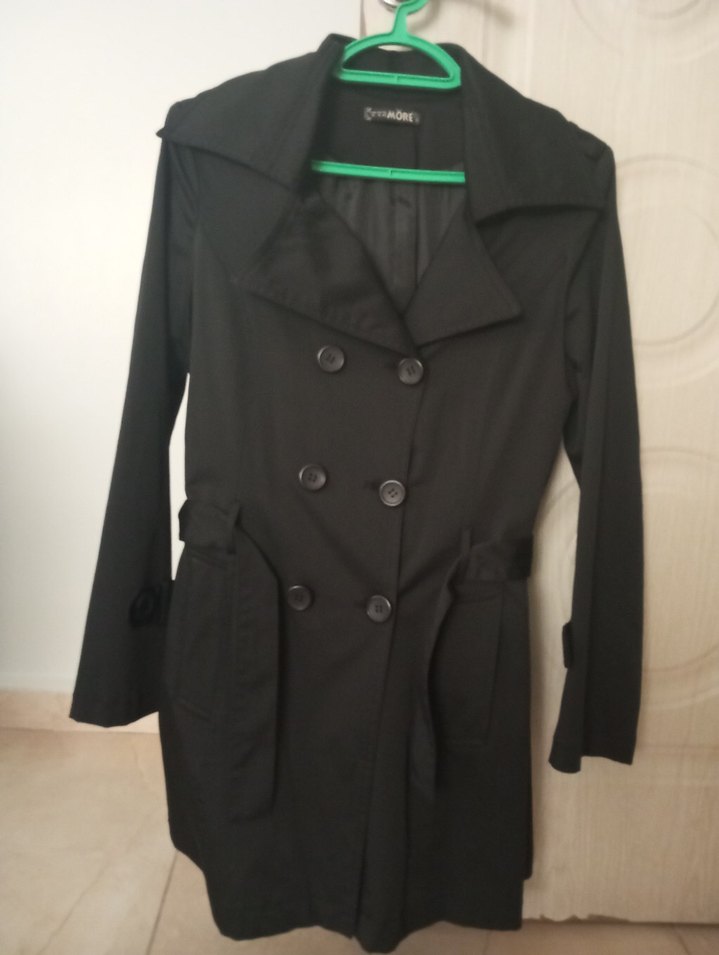 Düğmeli, siyah midi trençkot, kesik yaka ve uzun kollu. Cepli, düz kesim, rahat sentetik kumaştan, ofis için uygun.