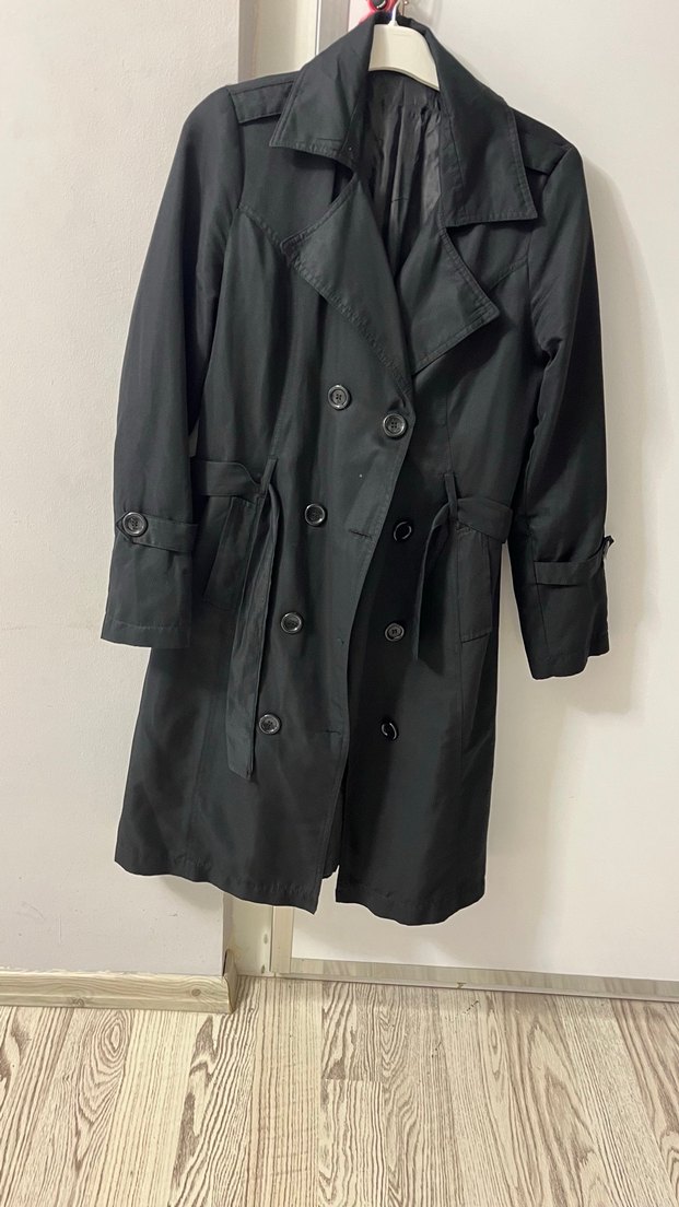 Düğmeli ön kapamalı, sivri yaka siyah midi trençkot. Sentetik kumaştan, uzun kollu ve rahat kesim. Günlük ve iş stiline uygun.