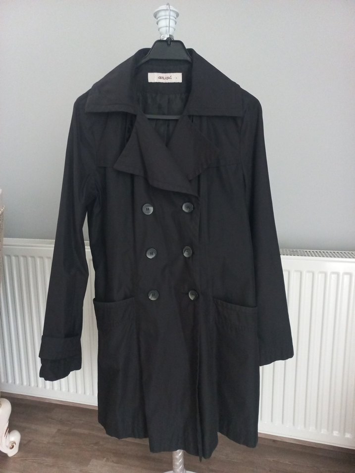 Düğmeli ve yakalı siyah midi trençkot, yumuşak ve ipeksi kumaştan, bol kesimdir. Askılı kolları ile gotik tarzda, ofis kullanımına uygundur.