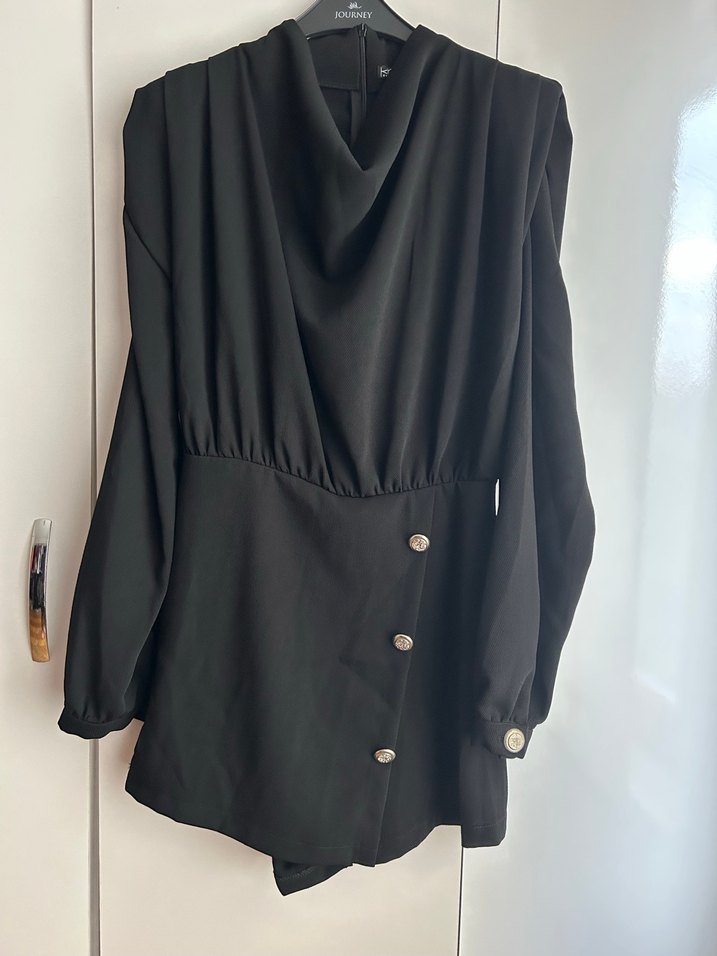 Düğmeli detaylı, şal yakalı,uzun ve vatkalı kollu siyah, satenimsi kumaştan yapılmış, midi boyda, vücuda oturan kadın tulumu.