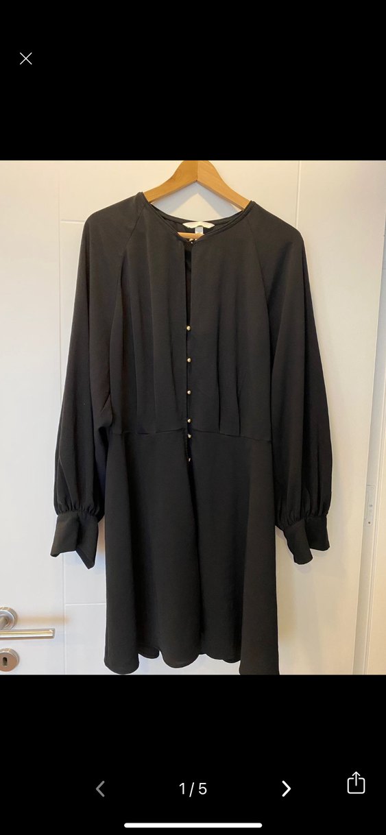 Siyah midi tunik, ipeksi kumaş, bol kesim ve uzun kolludur. Düğmeli ön ve V yakalı, ofis kullanımına uygun klasik şıklıkta.