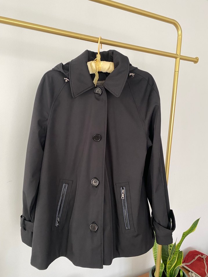 Düğmeli siyah midi yağmurluk, notched lapel yakalı ve uzun kolludur. Fermuarlı cepleriyle günlük kullanıma uygundur. ️