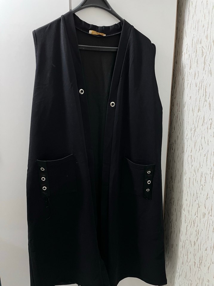 Siyah midi uzunlukta, düğmeli ve yakalı kadın yeleği, minimalist gotik tarzda, günlük kullanıma uygun, regular fit kesimde.