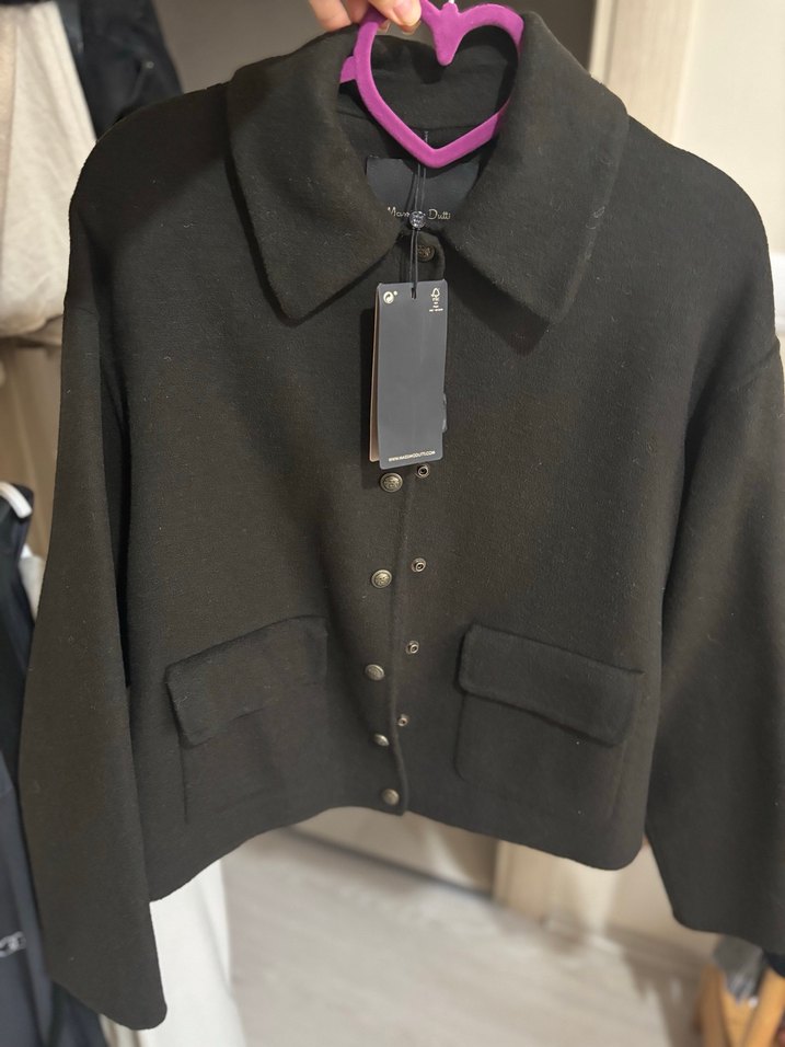 Düğmeli, yün kumaştan yapılmış siyah midi uzunlukta, geniş kesim ve uzun kollu kadın ceket.