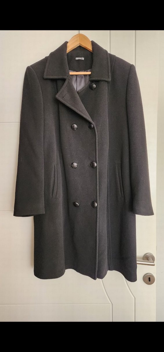 Düğmeli önü ve klasik kesimiyle siyah yün kaban, normal uzunlukta ve uzun kolludur, ofis için uygundur.
