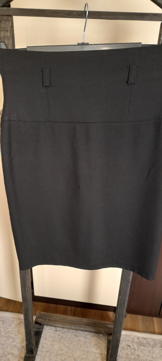 Düğmeli tasarıma sahip, midi boy, siyah kalem etek, pürüzsüz sentetik kumaştan yapılmıştır ve ofis kullanımı için uygundur.