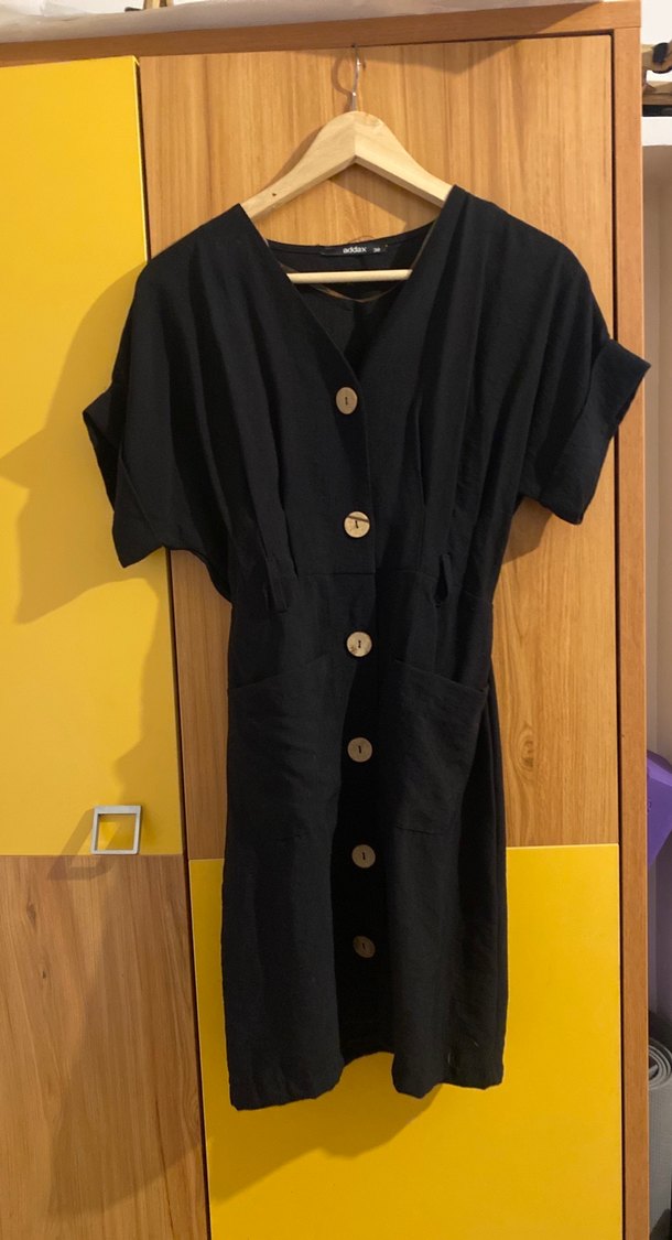 Siyah keten kumaştan, V yaka ve kısa kollu midi elbise. Önden düğmeli ve bol kesim, günlük kullanım için uygun. Kullanılmadı