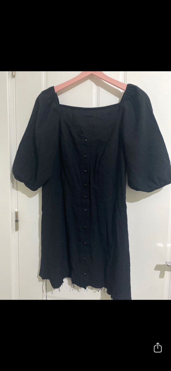 Siyah keten midi elbise, tekne yaka ve kısa balon kollu. Düğmeli ve bol kesim, günlük kullanıma uygun. Uzunluğu 70 cm