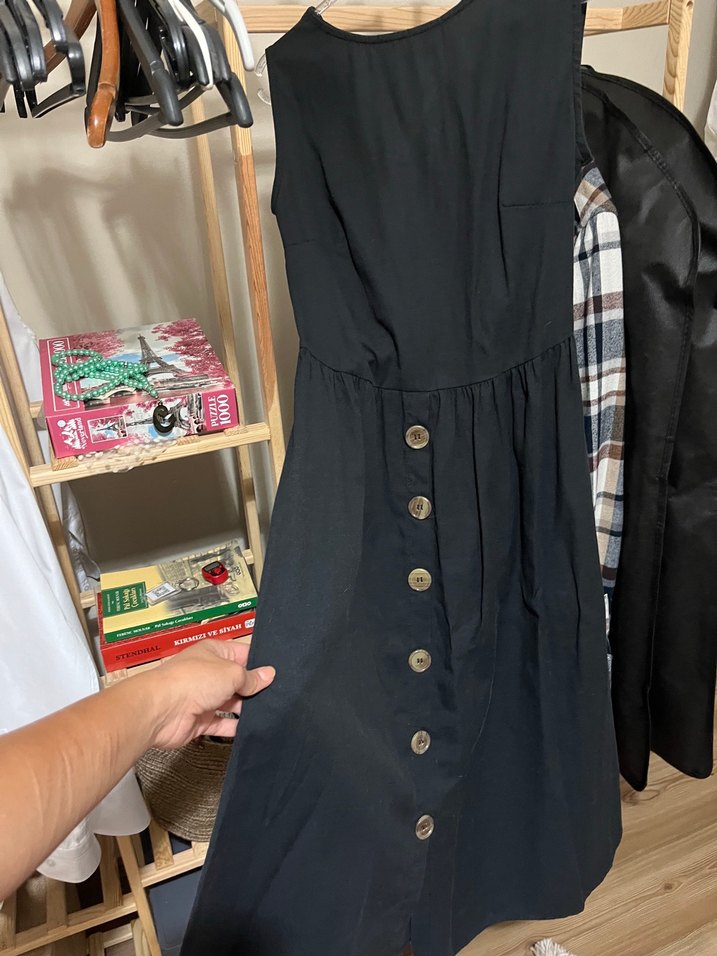 Düğmeli, keten kumaştan, siyah midi uzunlukta, salaş kesim ve kolsuz elbise. Notlu yakası günlük rahat kullanıma uygundur.