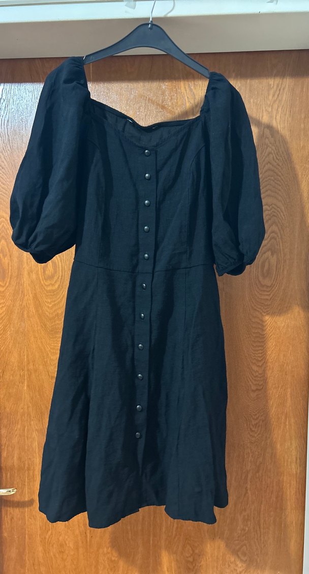 Siyah keten midi elbise, tek düğmeli ön kapama, kısa balon kollu ve salaş kesim ile minimalist gotik tarz sunar.