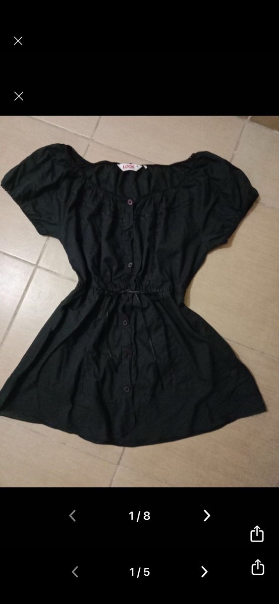 Düğmeli, kısa kollu siyah keten midi elbise, tek renk ve bol kesimdir. Minimalist goth tarzıyla günlük kullanıma uygundur.