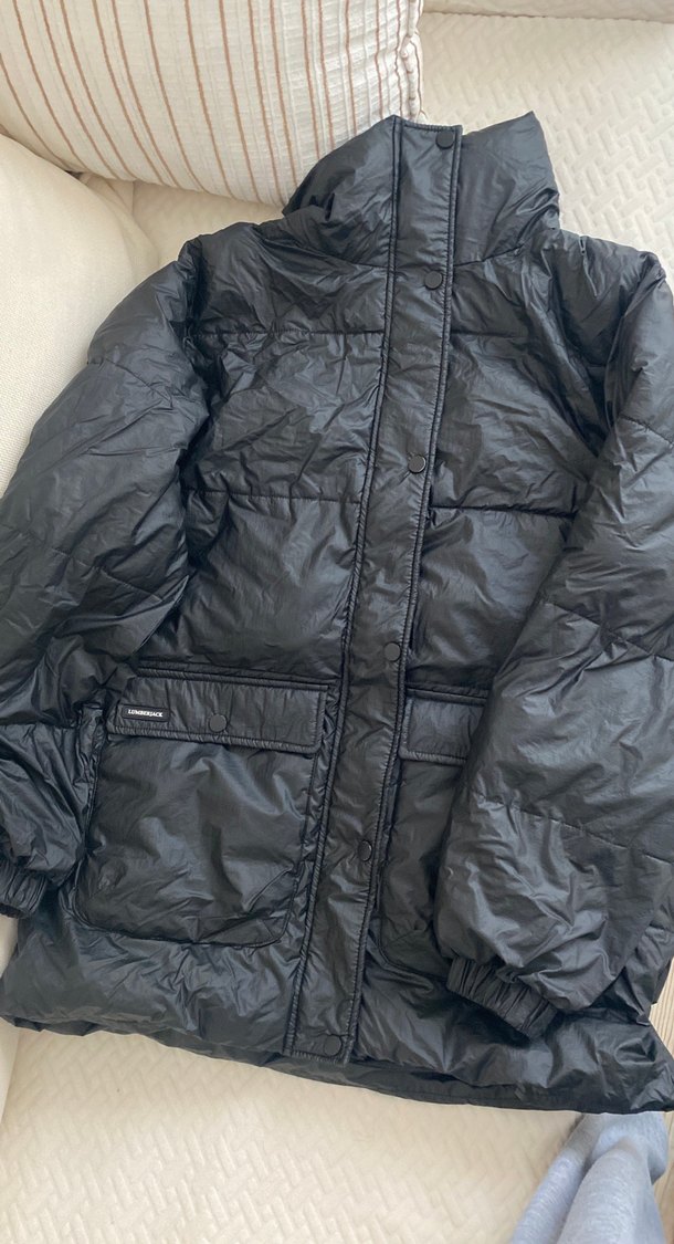 Düğmeli, siyah, midi uzunlukta, notched lapel yakalı, sentetik kumaştan yapılmış, gençlere uygun, dar kesim kışlık kadın mont.