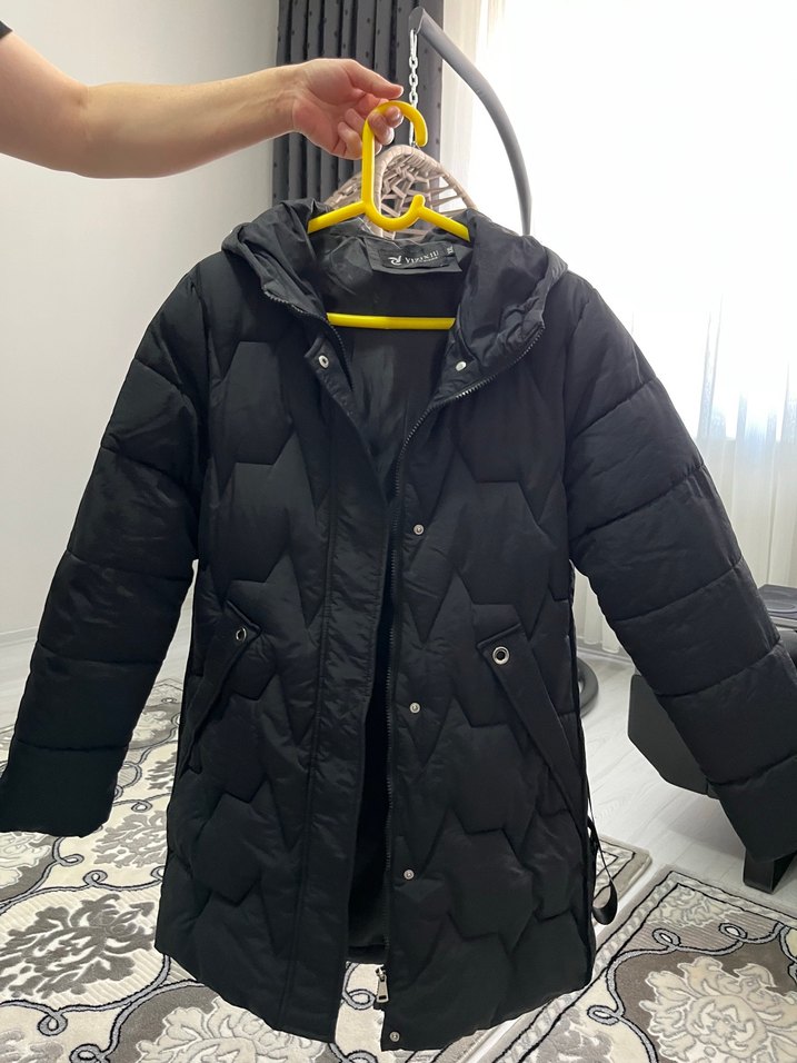 Düğmeli, fitted siyah kışlık mont uzun kollu ve notched lapel yakaya sahiptir. Yumuşak sentetik kumaştan yapılmış, günlük kullanıma uygun sıcak ve rahat sokak stili sunar.