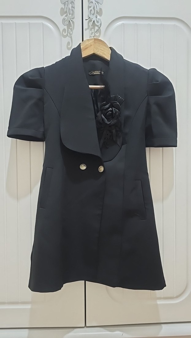 Düğmeli, kısa kollu siyah midi kaban, ipeksi kumaştan, klasik zarafet ve Parisli gotik tarzı yansıtıyor. Trendyoldan almıştık. son resim alıntı. kolyesi ve çantası yok. fiyata dahil edilmiştir.