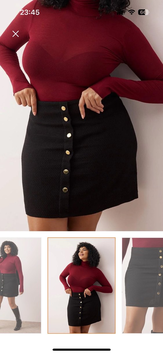 Düğmeli detaylı, siyah midi mini etek. Sentetik kumaştan, ofis ve günlük sokak stili için uygun, vücuda oturan kesim.