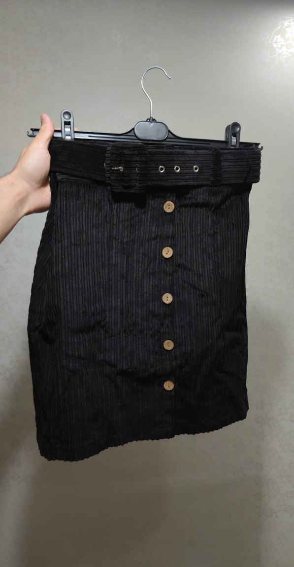 Düğmeli ön kısmı ve uyumlu kemeri olan siyah midi mini etek, sentetik kumaştan, trend ve rahat Paris tarzı için uygundur.