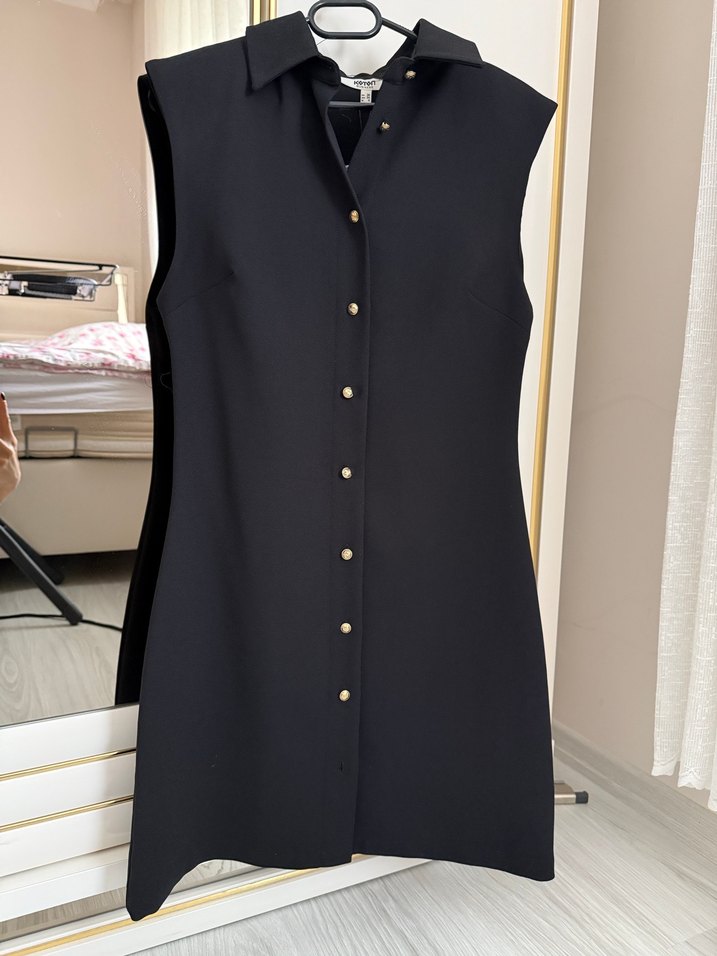 Düğmeli, yakalı, kolsuz siyah midi elbise. Düz ve rahat kesim, ofis kullanımı için uygun