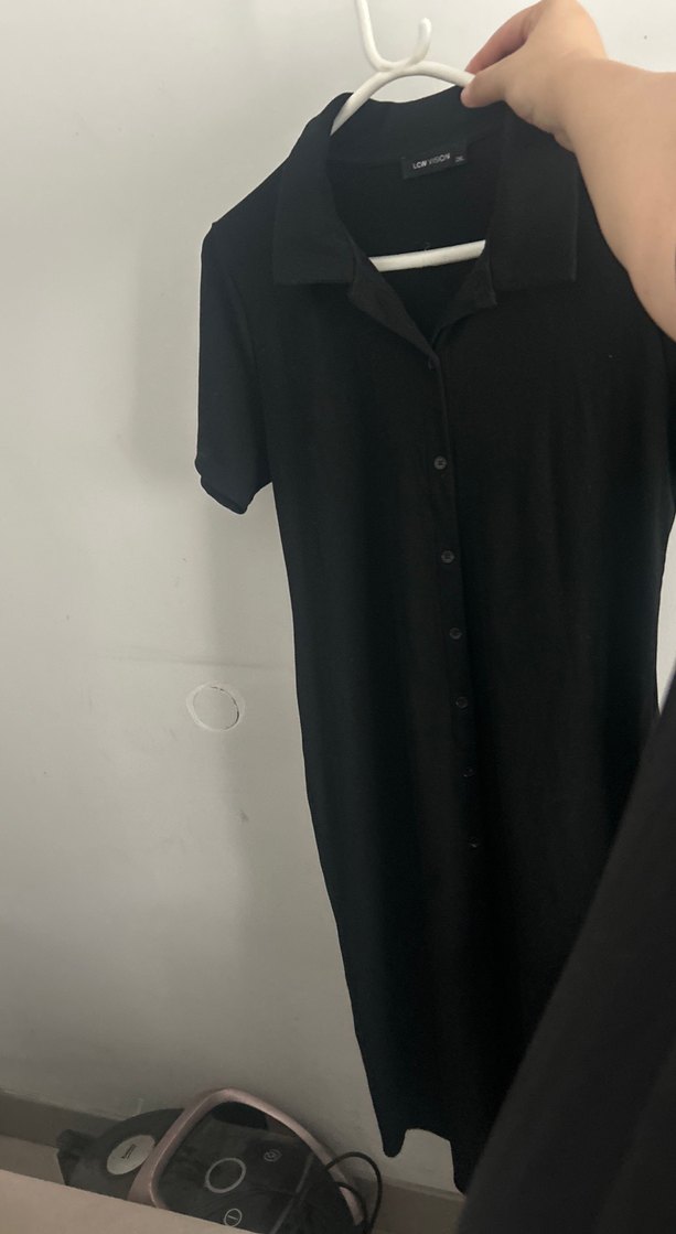Düğmeli, kısa kollu, yakalı siyah midi elbise, ince kesimi ve düz dokusu ile ofis için uygun minimalist gotik tarzda tasarlanmıştır.