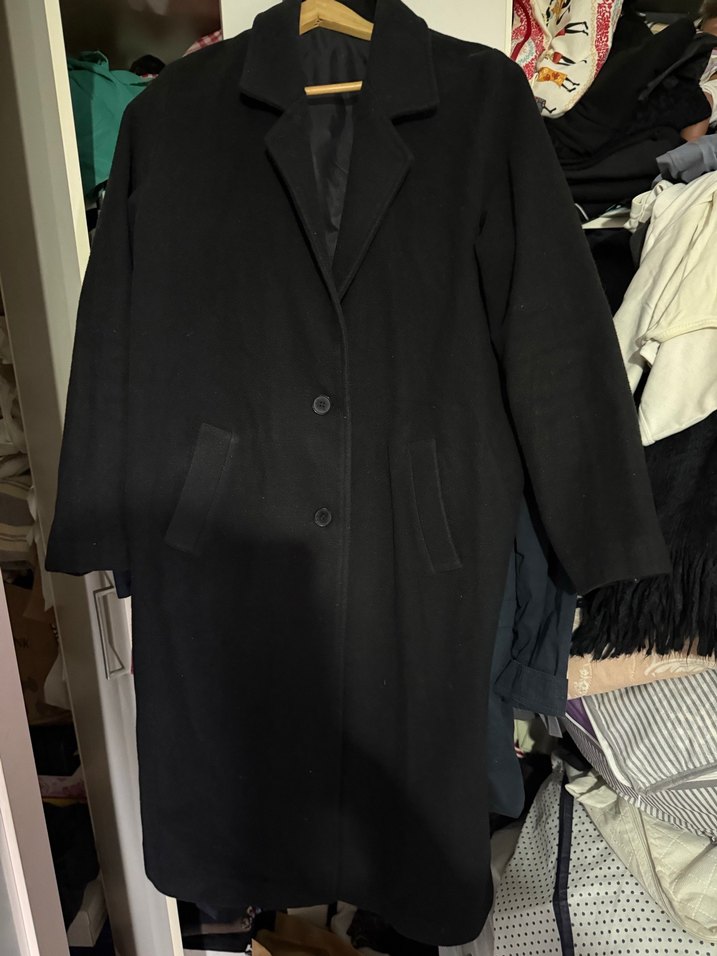 S-M beden uygundur. Düğmeli, siyah midi boy kaban, uzun kollu ve regular fit. Yumuşak, sıcak kumaştan, ofis için uygun goth tarzında bir parça.