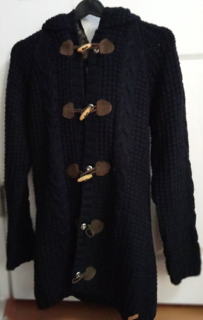 Fitted kesim lacivert Hırka, örgü peluş yaka detaylıdır. Uzun kollu ve düğmeli, günlük kullanıma uygundur.