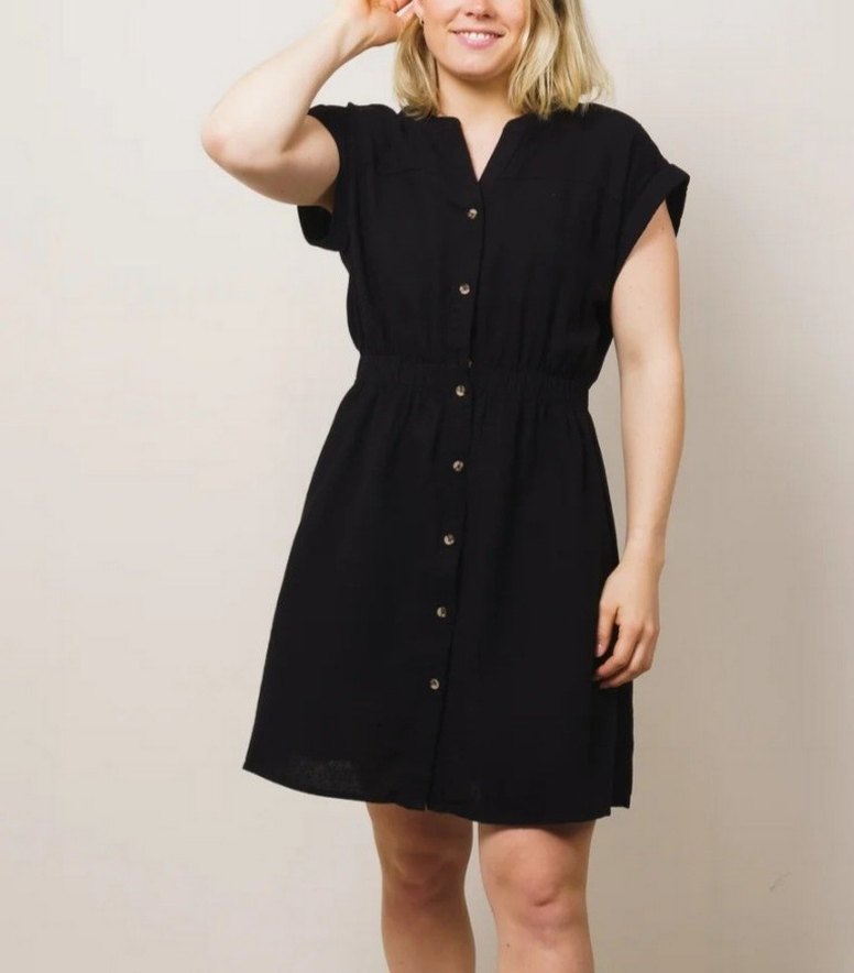 Düğmeli, kısa kollu, V yakalı siyah midi elbise. Sentetik kumaştan, bol kesim, günlük rahat kullanıma uygun.