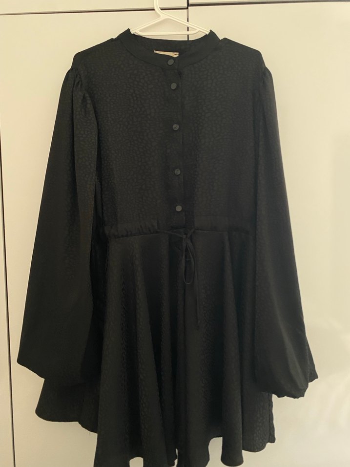 Siyah midi tunik, yüksek yakalı, düğmeli ve uzun kolludur. Saten kumaştan, bol kesim ve gotik tarzda,