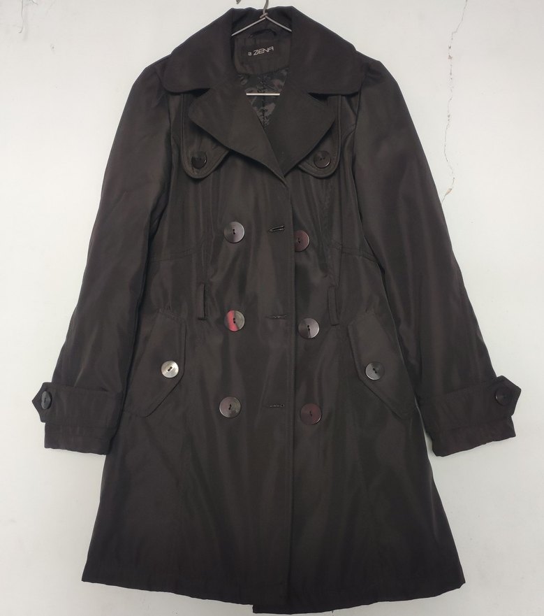 Düğmeli, siyah midi trench coat, yakası notched lapel, uzun kollu ve bol kesimdir. Sentetik kumaştan yapılmıştır, günlük kullanım için uygundur.
