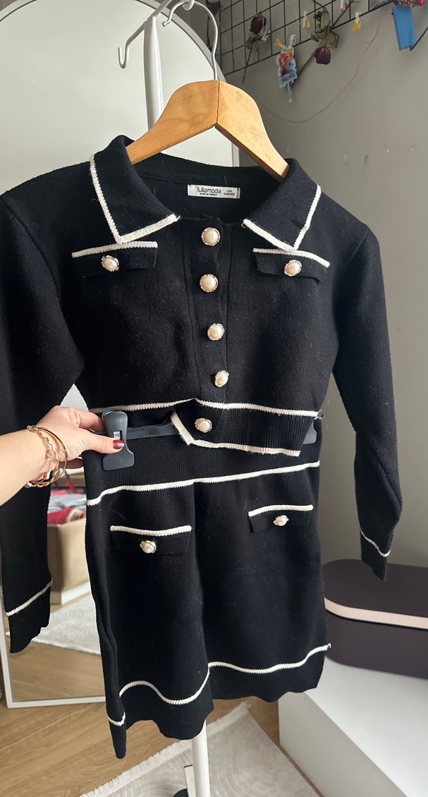 Düğmeli, uzun kollu, yakalı siyah triko etek bluz takım , beyaz şerit detayları ve baskılı desen ile günlük kullanıma uygun şık bir modeldir.