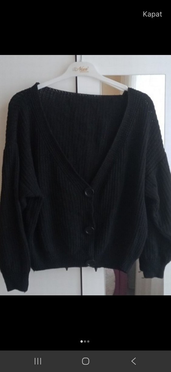 Siyah triko hırka, düğmeli, uzun kollu ve V yakalıdır. Salaş kesimi ve midi boyu ile rahat ve şık bir goth tarz sunar.