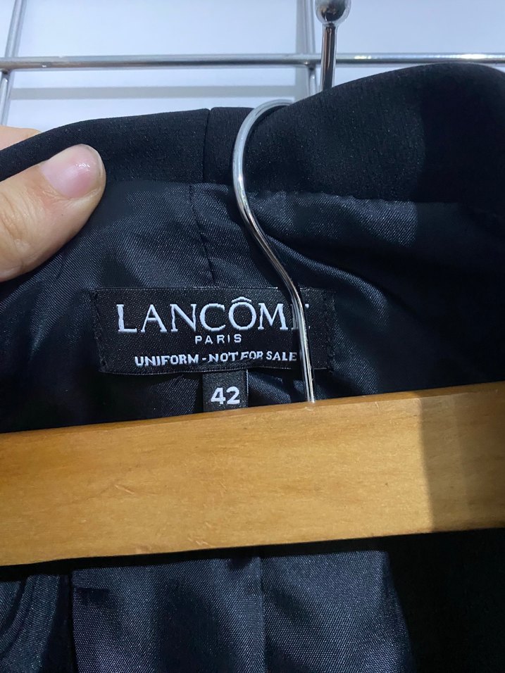 Düğmeli, yakalı ve askılı kollu siyah midi tuxedo ceket. Fitted kesim, ofis için uygun. LANCOM PARIS etiketi bulunur.