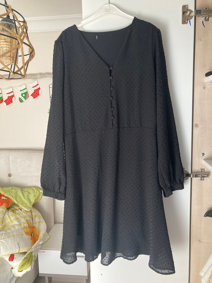 Bu siyah midi elbise, V yaka tül detay ve uzun kollara sahiptir. Düğmeli ve nakış detaylı, bol kesimdir, ofis için uygundur. İçinde ful astarı mevcuttur etek kısmı çan şeklinde bel oturtmalı olduğu için fit bir görünüm sağlar kırışmayan ütü istemeyen efil efil bir elbise en az üç mevsim kullanıma uygundur