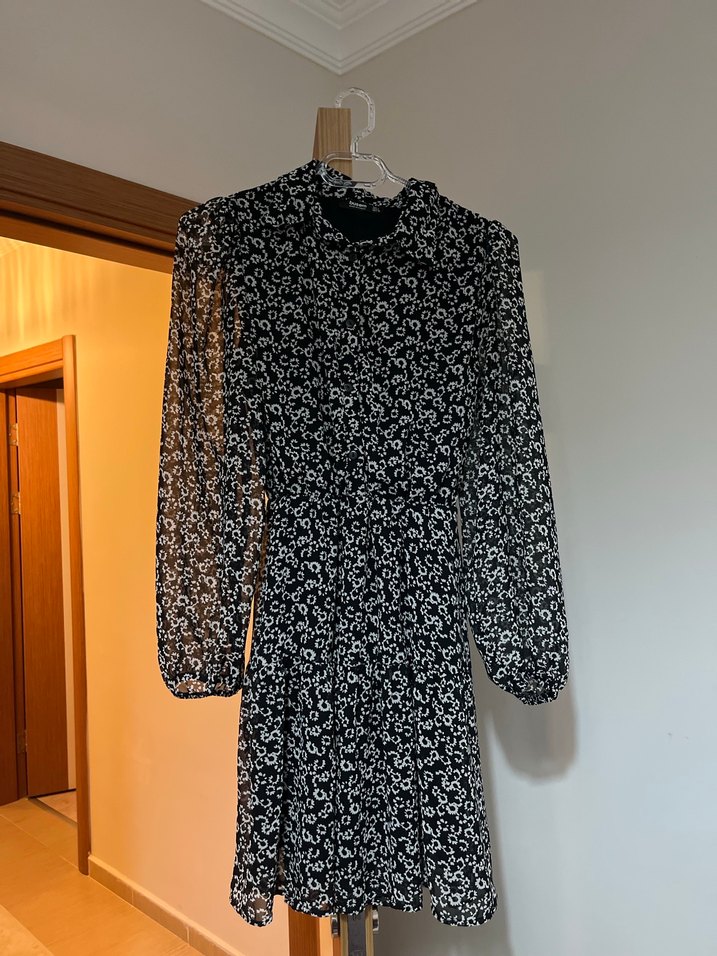 Düğmeli, uzun kollu ve yüksek yakalı siyah tie-dye desenli midi elbise, yumuşak sentetik kumaştan, günlük kullanım için uygundur. 1 kez evlilik teklifinde giyinilmiltir. S-m-l beden uyumludur