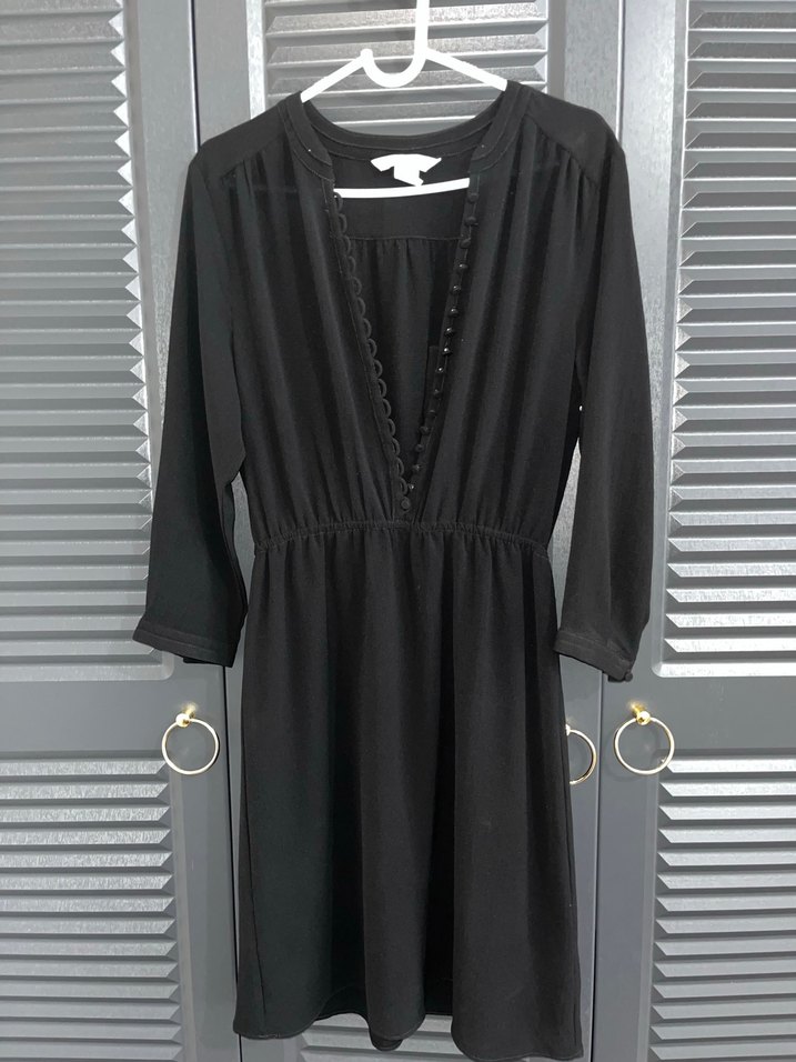 H&M. Düğmeli, V yakalı siyah midi elbise, yarım kollu ve bol kesimdir. Düğmeler istenilen şekilde açılabilir. 38 beden ancak 34 ve 36 bedende de çok bol olan bir elbise değil. %98 Polyester, %2 Elastan yapıdadır. Eski sezon bir ürün