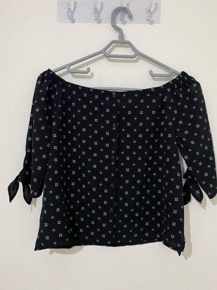 Düğmeli, siyah mini bluz, kayık yaka ve kısa kollu. Kollarında bağlama detayı ve salaş kesimi var. Hafif batik desenli, gündelik sokak stili için uygun.