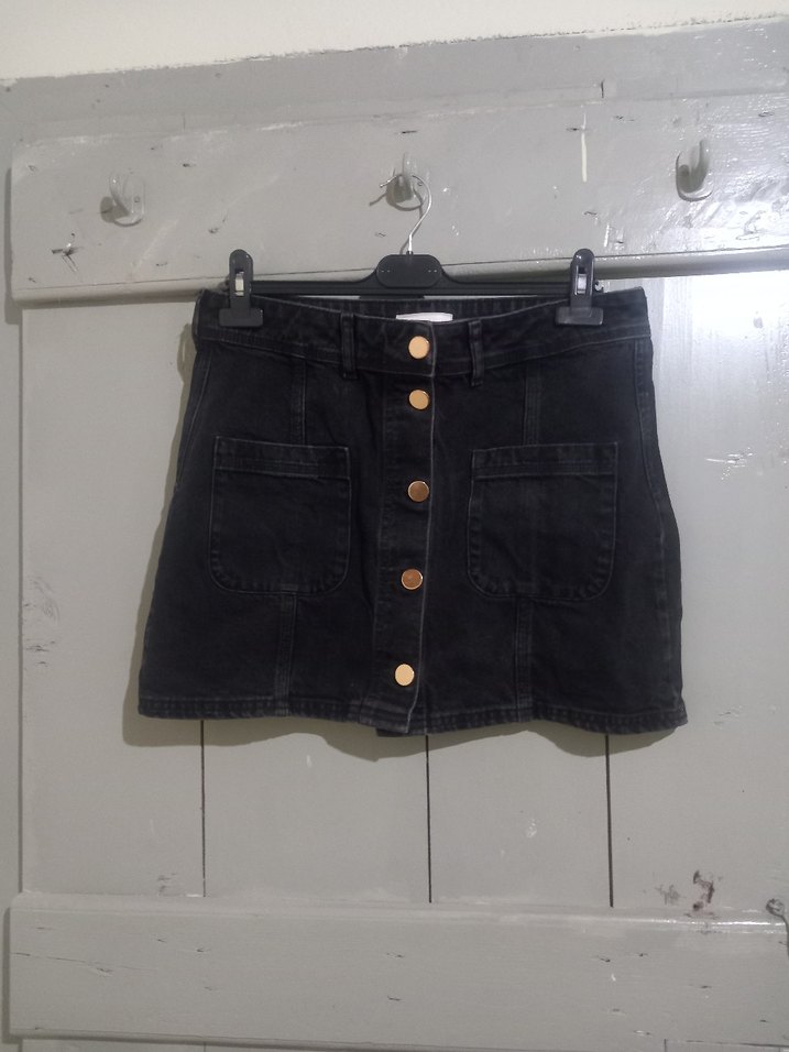 Düğmeli ön kısmı ve büyük ön cepleri olan siyah, dar kesim mini denim etek. Rahat sokak stili için dayanıklı kumaştan yapılmıştır. Günlük kullanıma uygundur.