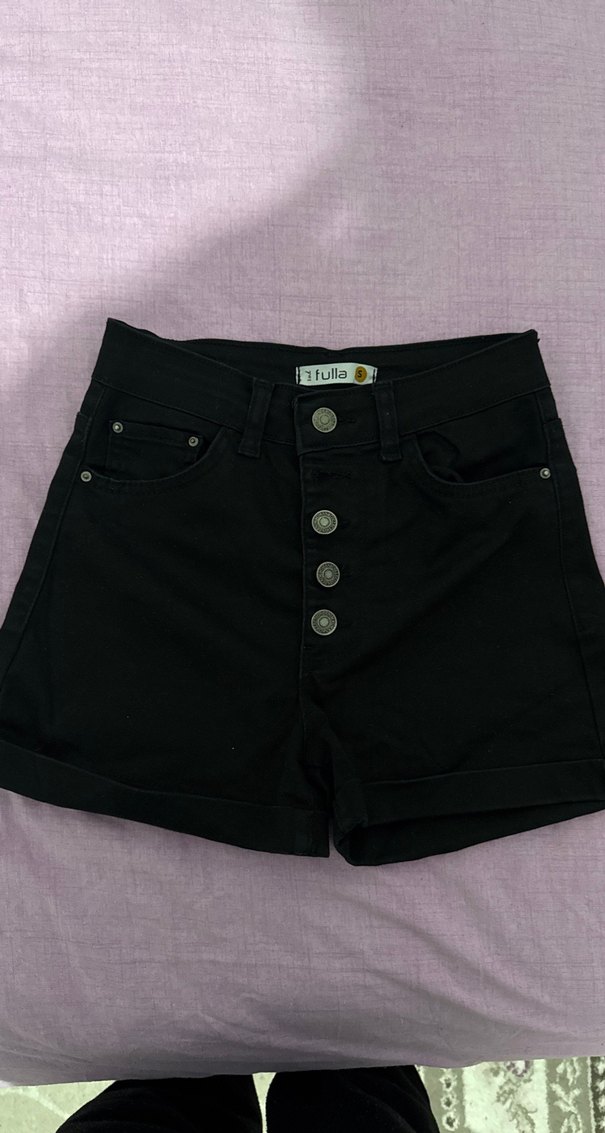 Düğmeli kapama ve dar kesimiyle siyah mini denim şort. Desensiz, günlük sokak stili için uygun. Marka: Ulla.